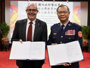 【記者 彭可可/綜合報導】為厚植我國警政人才之國際競爭力,並深化與國際刑事司法學術機構之合作,警政署與澳洲麥考瑞大學(Macquarie University)於今日上午11時舉辦教育訓練合作備忘錄簽署儀式,由副署長廖訓誠與該校全球事務副校長Anthony Cahalan代表簽署。