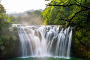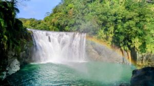 被譽為「台灣尼加拉瀑布」的十分瀑布,為全臺最大垂簾型瀑布,落差達20公尺,水勢奔騰、氣勢磅礡,水霧瀰漫間在陽光照射下常可見夢幻彩虹,每年吸引眾多國內外遊客慕名前來。